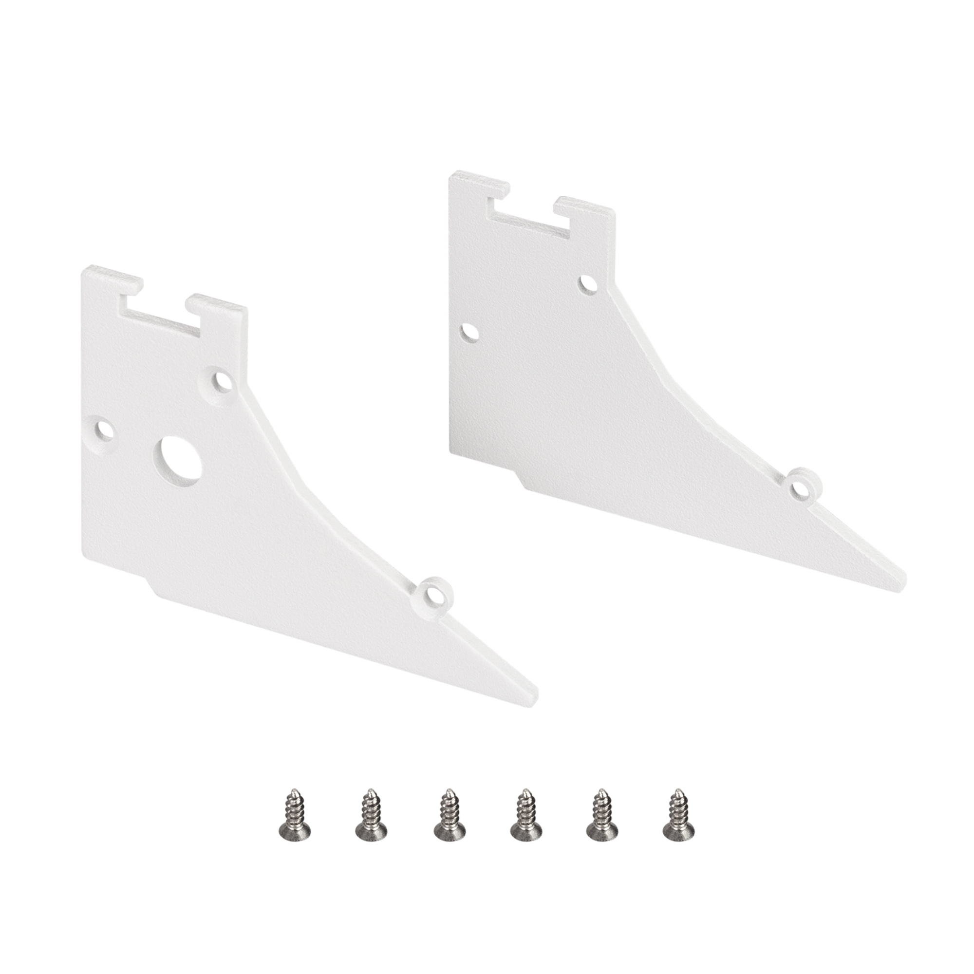 Комплект заглушек для профиля FANTOM-W45-BEVEL. Материл - алюминий. Цвет - белый. В комплекте 2 заглушки (левая с отверстием - 1 шт., правая без отверстия - 1 шт.) и 6 шурупов. Цена за комплект.