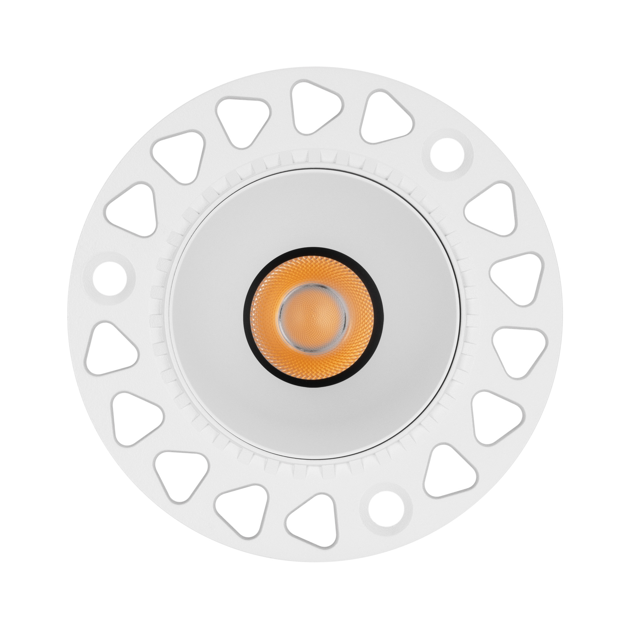 Встраиваемый светильник даунлайт. Мощность 7 Вт, св. поток 405 лм, 55 лм/Вт, теплый 3000 K, CRI>92, угол 24°, напряжение питания 230 В. Белый круглый корпус из алюминия, белый матовый отражатель, степень защиты IP20 . Размер: диаметр 85 мм, высота 72 мм. Монтаж встраиваемый, установочное отверстие: диаметр 55 мм.