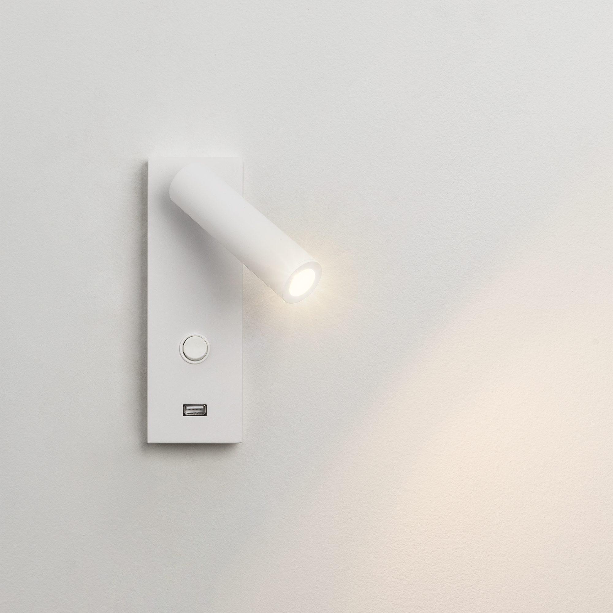 Накладной настенный светильник 3Вт, белый алюминиевый корпус. Цвет ТЕПЛЫЙ БЕЛЫЙ 3000K, св.поток 200лм, CRI(Ra)>80, угол 20°. Размер Основание 180х60х21мм, Светоизлучатель Ø30×110 мм. IP20. Питание AC220-240V, 3Вт, встроенный драйвер. Встроенный USB порт для зарядки.