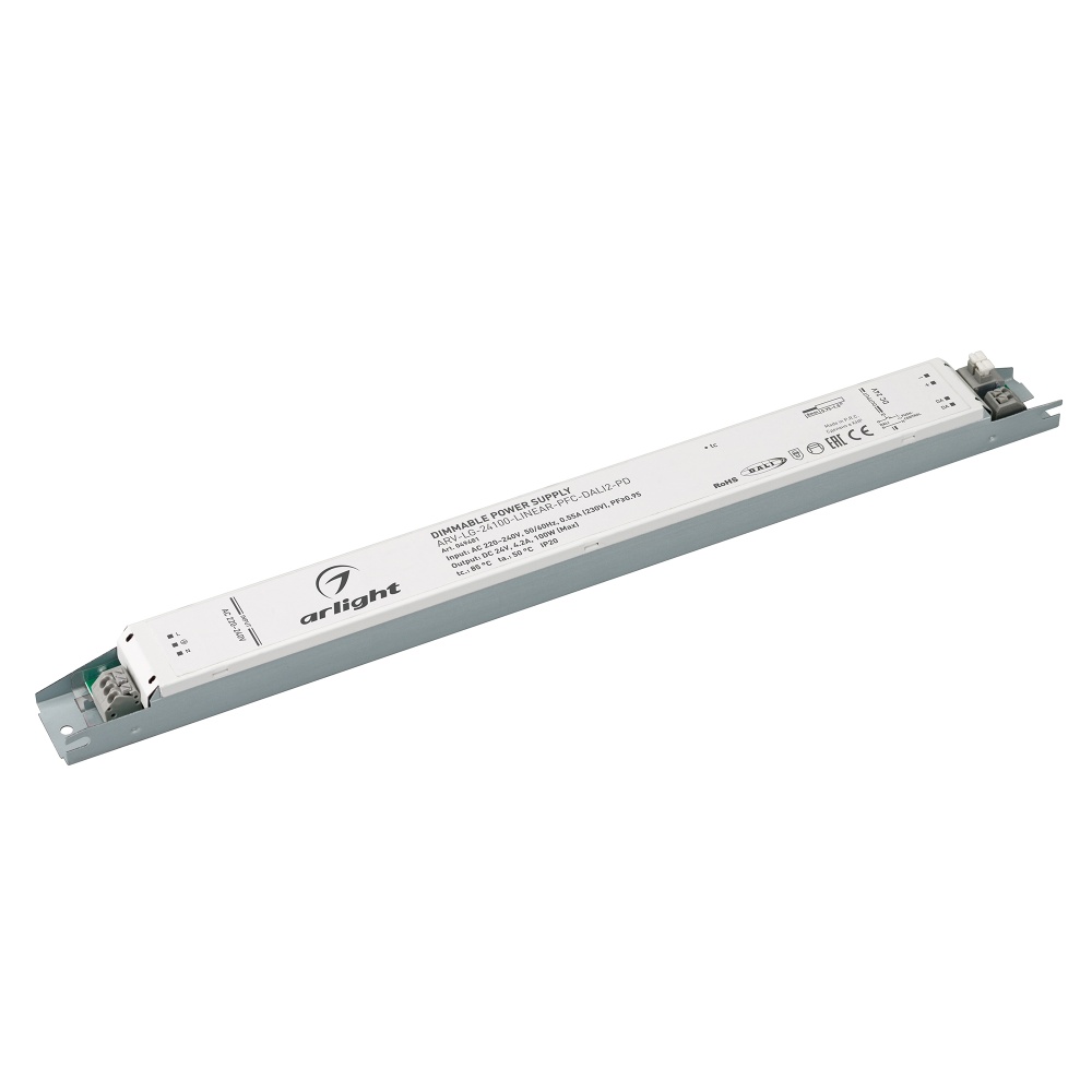 Диммируемый источник напряжения по протоколу DALI 2.0 и функцией PUSH DIM с гальванической развязкой для светодиодных изделий. Входное напряжение 220-240 VAC. Выходные параметры: 24 В, 4,2 А, 100 Вт. Встроенный PFC >0,97. Негерметичный алюминиевый корпус IP 20. Габаритные размеры длина 280 мм, ширина 30 мм, высота 21 мм. Гарантийный срок 5 лет.