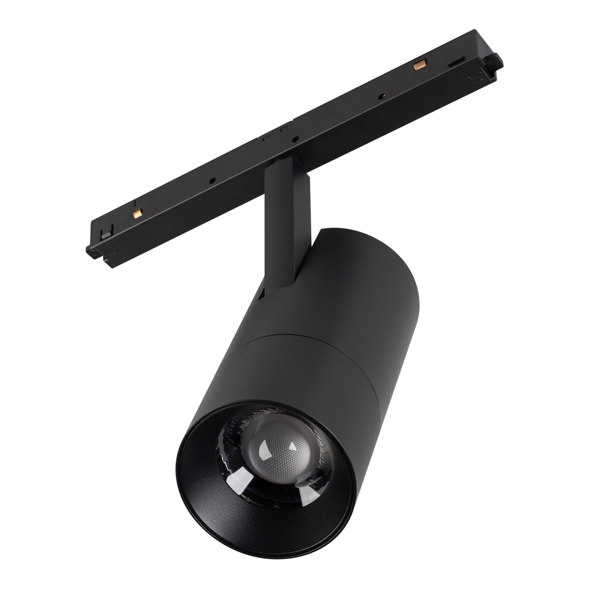 Светильник для магнитных треков MAG-ORIENT шириной 26 мм, с управлением по DALI. Мощность 15 Вт, св. поток 1180 лм, 79 лм/Вт, теплый 3000 K, CRI>93, угол 20-60°, напряжение питания 48 В. Черный фигурный корпус из металл, экран поликарбонат, степень защиты IP20. Размеры LxWxH 204x66x211 мм.
