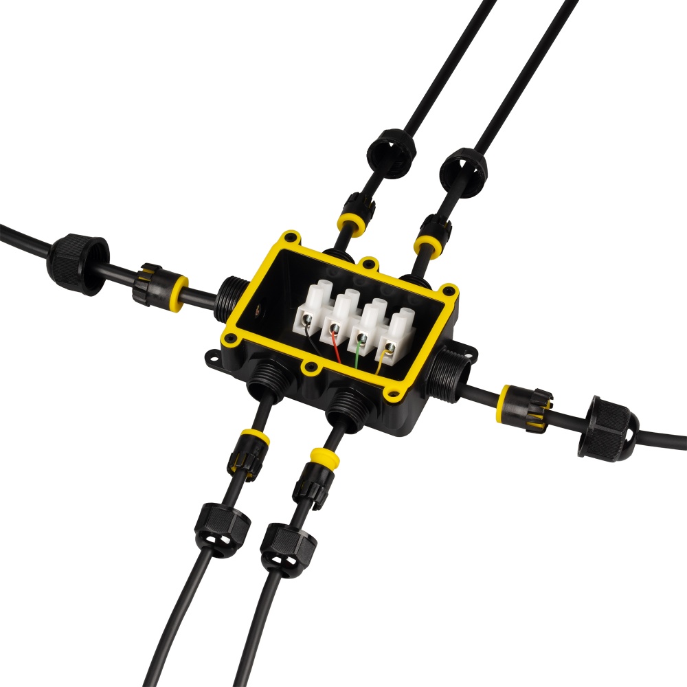 Коробка распределительная пластиковая с шестью выходами для соединения проводов диаметром 4-8 мм, сечением 0,5-2,5 мм2. Номинальный ток 24 А. Номинальное напряжение 450 В. Цвет черный. Степень защиты IP68. Рабочая температура -40/ +60°С. Подключение питания без пайки.