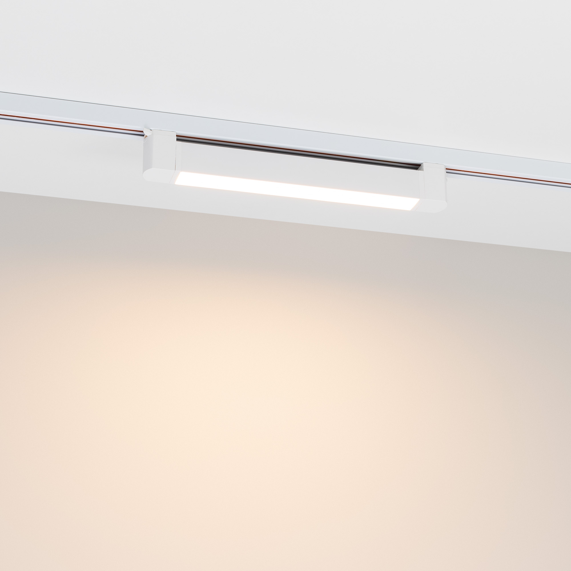 Светильник подвесной для треков/шин 2 провода. Угол поворота светильника 90° (45°+45°). Мощность 10 Вт, св. поток 800 лм, 80 лм/Вт, дневной 4000 K, CRI>90, угол 100°, напряжение питания 230 В. Белый корпус из алюминия, материал рассеивателя PC, степень защиты IP20. Размер: длина 343 мм, ширина 33 мм, высота 50 мм. Монтаж на трек 1-фазный. Драйвер встроенный, пульсация <1%.