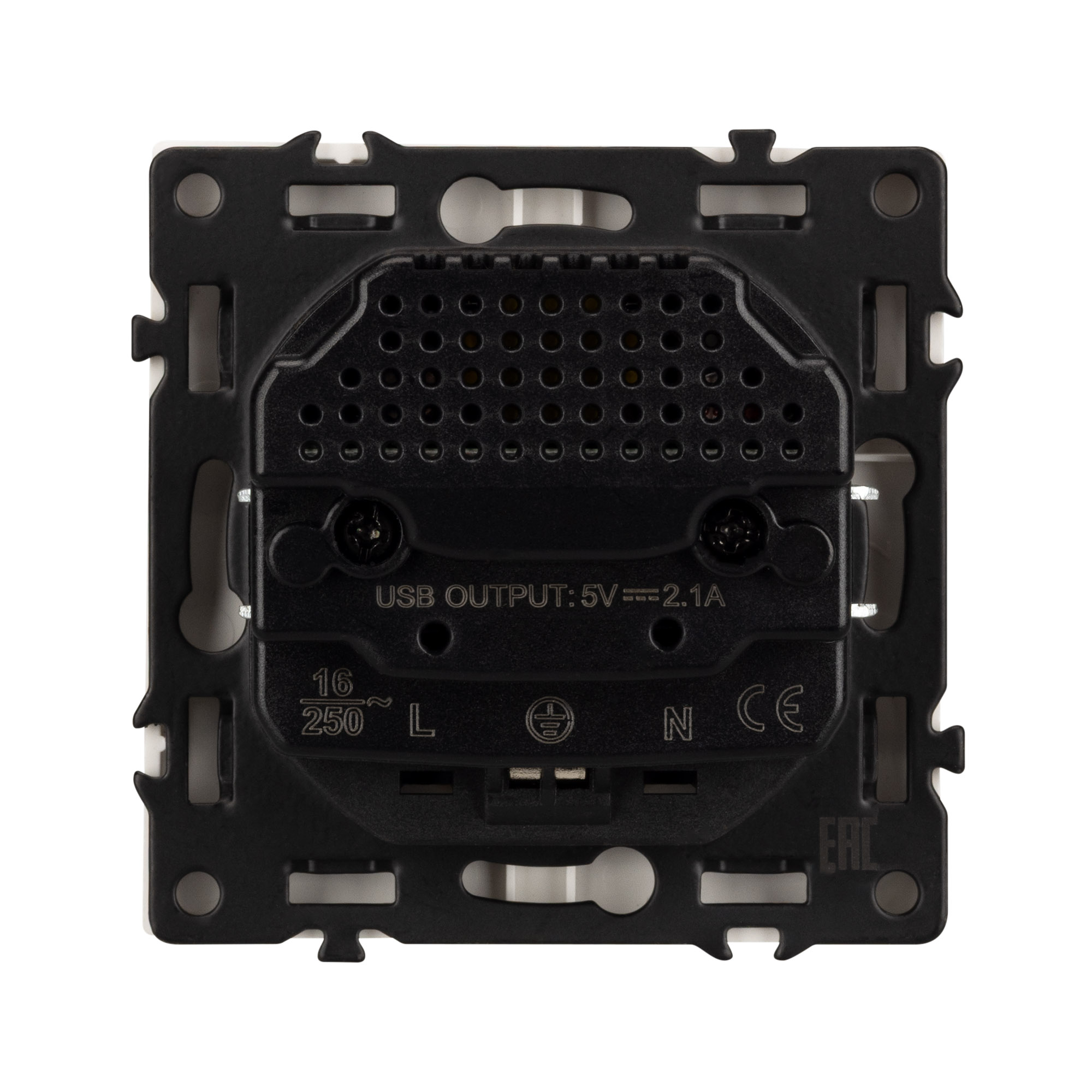 Механизм розетки с заземлением на 1 пост и 2USB Type A порта. Цвет - никель, с Soft-Touch поверхностью. Без фронтальной рамки. Уровень пылевлагозащиты IP20. Розетка устанавливается в стандартный подрозетник круглого сечения диаметром 60мм.