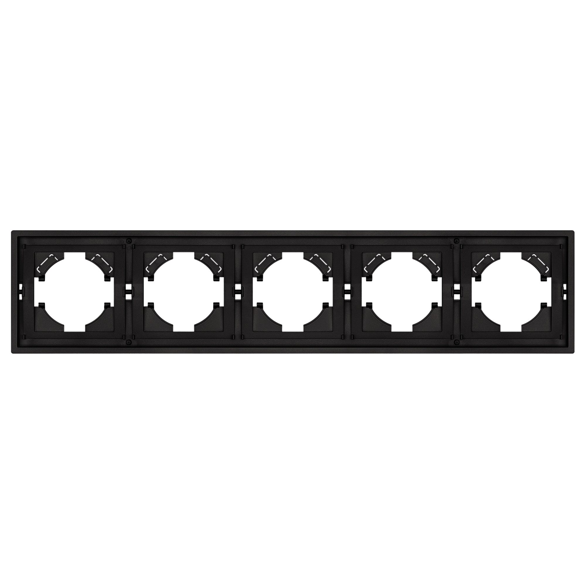 Рамка пластиковая на 5 постов, под встраиваемый механизм. Цвет - черный, с Soft-Touch покрытием. Среднего уровня герметичности IP20. Ориентация монтажа горизонтальная.