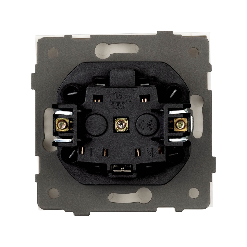 Механизм розетки с заземлением и влагозащитной крышкой на 1 пост. Цвет - белый, с Soft-Touch покрытием. Без фронтальной рамки. Уровень пылевлагозащиты IP44. Розетка устанавливается в стандартный подрозетник круглого сечения диаметром 60мм.