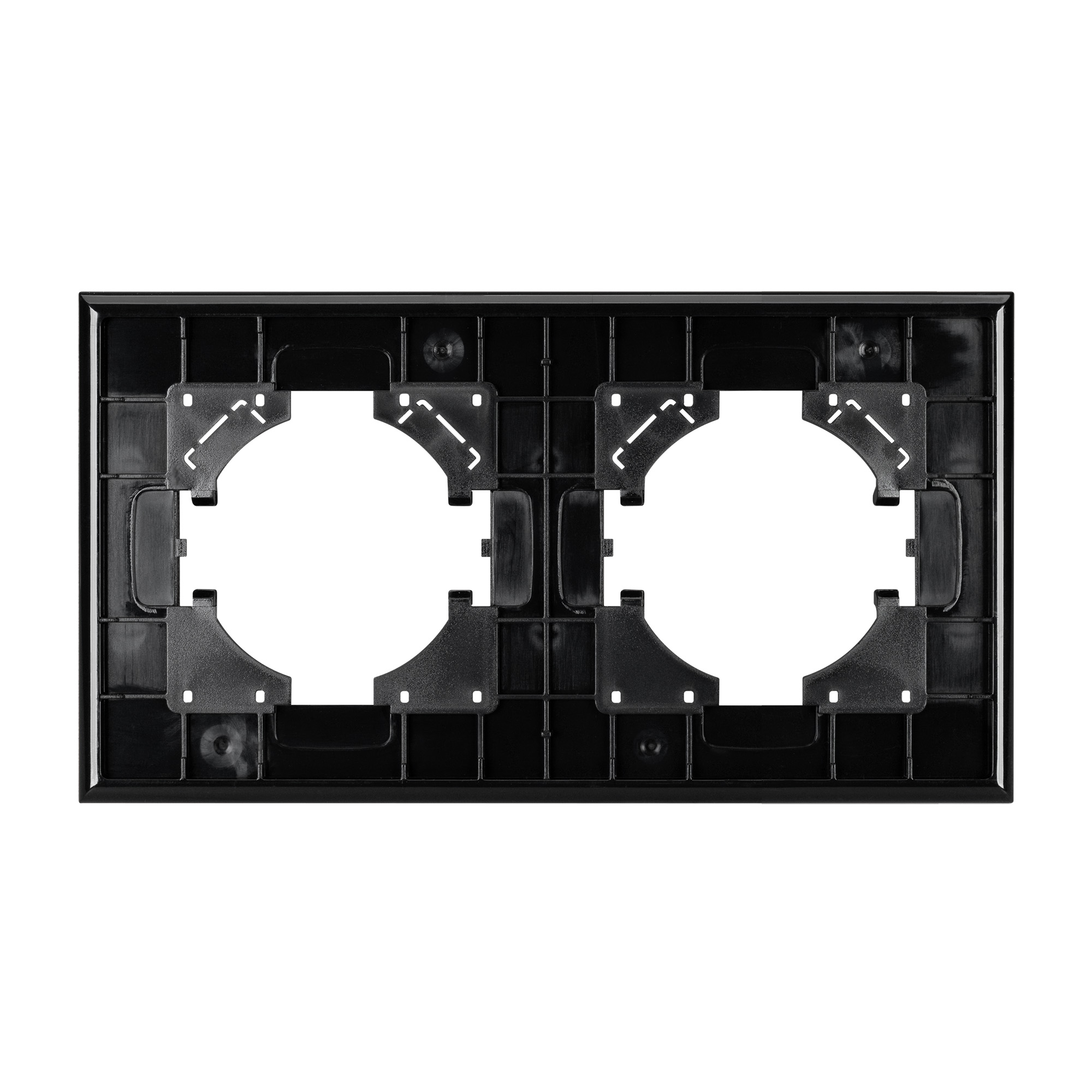 Рамка пластиковая на 2 поста, под встраиваемый механизм, с накладкой из натурального дерева. Цвет накладки - натуральное дерево (осветленный), цвета рамки - черный. Среднего уровня герметичности IP20. Ориентация монтажа - горизонтальная (основным ориентиром служат посадочные выступы для накладки механизма).