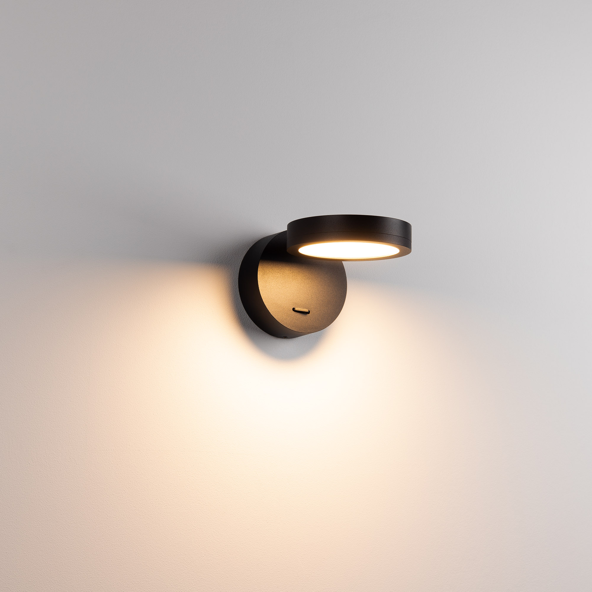 Накладной поворотный настенный светильник. Мощность 6 Вт, св. поток 360 лм, 60 лм/Вт, теплый 3000 K, CRI>90, угол 110°, напряжение питания 230 В. Черный круглый корпус из алюминия, степень защиты IP20. Размер основания Ø90 x 32 мм. Размер светоизлучателя Ø100 x 21 мм. Монтаж накладной. Драйвер встроенный, пульсация <1%.