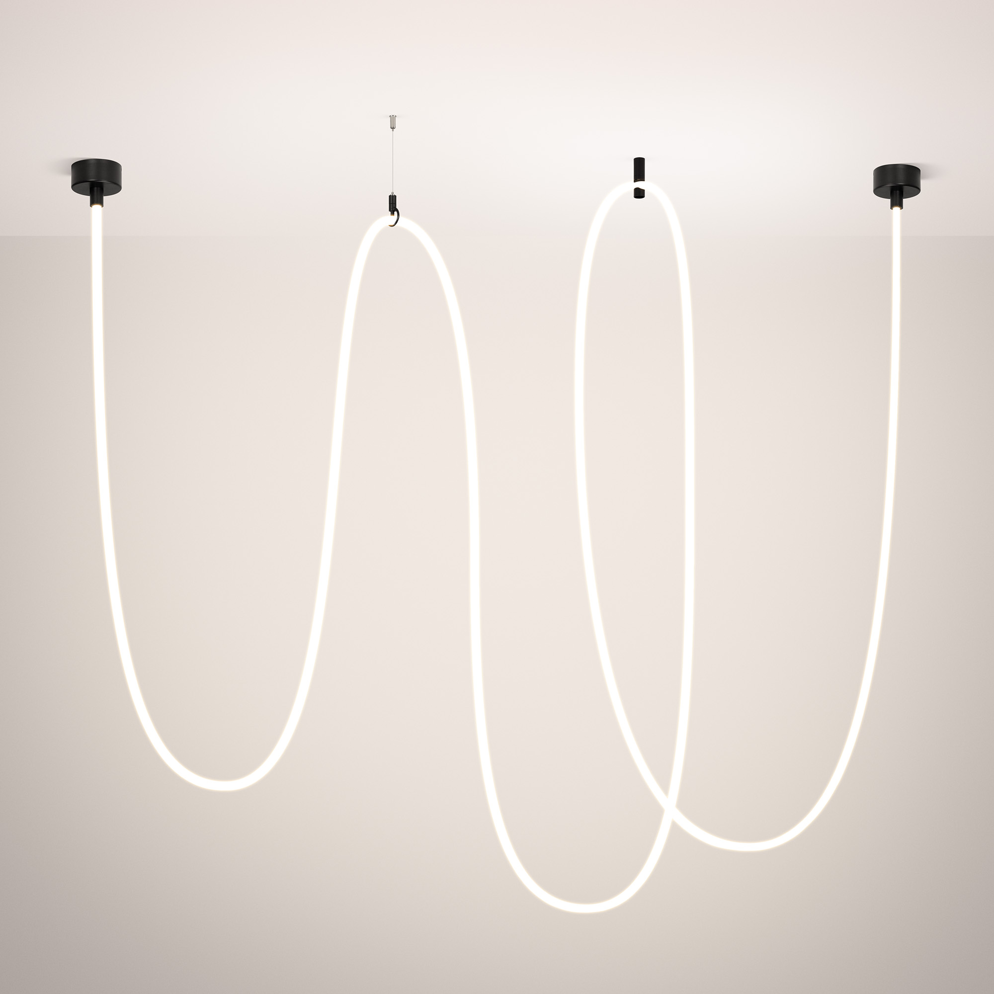 Подвесной светильник. Мощность 110 Вт, св. поток 5960 лм, 54 лм/Вт, тёплый 3000 K, CRI>90, угол 360°, напряжение питания 230 В. Черный круглый корпус из стали, силиконовая герметичная лента, степень защиты IP20. Размер: общая высота чаши 85 мм, высота чаши без вывода под неон 50 мм, диаметр вывода под неон 35 мм, диаметр чаши 130 мм, диаметр силиконовой герметичной ленты 18 мм, длина силиконовой герметичной ленты 10000 мм. Монтаж накладной. Блок питания 24 В, 2500 мА, пульсация <5% (2 шт.). Аксессуары (подвес и крепление) приобретаются отдельно.