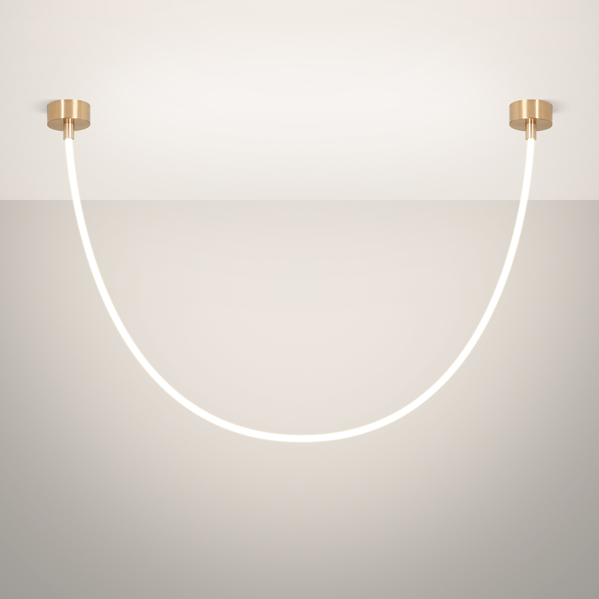Подвесной светильник. Мощность 36 Вт, св. поток 2300 лм, 63 лм/Вт, дневной 4000 K, CRI>90, угол 360°, напряжение питания 230 В. Золотой круглый корпус из стали, силиконовая герметичная лента, степень защиты IP20. Размер: общая высота чаши 85 мм, высота чаши без вывода под неон 50 мм, диаметр вывода под неон 35 мм, диаметр чаши 130 мм, диаметр силиконовой герметичной ленты 18 мм, длина силиконовой герметичной ленты 2500 мм. Монтаж накладной. Блок питания 24 В, 1880 А, пульсация <5%.