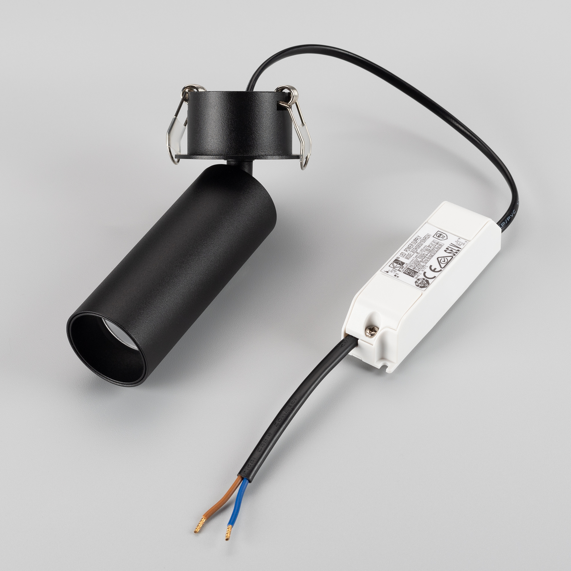 Светильник встраиваемый откидной. Мощность 7 Вт, св. поток 490 лм, 70 лм/Вт, теплый 3000 K, CRI>90, угол 36°, напряжение питания 230 В. Черный круглый корпус из алюминия, экран PMMA, степень защиты IP40. Размер: диаметр 35 мм, высота светового модуля 90 мм, высота основания 1.5 мм. Угол поворота 350°, угол наклона 90°. Монтаж встраиваемый, установочное отверстие: диаметр 45 мм, глубина 29 мм. Драйвер в комплекте 30-40 В, 150 мA, пульсация <1%.