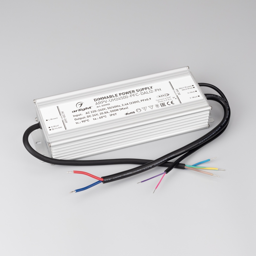 Диммируемый источник напряжения по протоколу DALI2.0 с гальванической развязкой для светодиодных изделий. Входное напряжение 220-240 VAC. Выходные параметры: 24 В, 20.8 А, 500 Вт. Встроенный PFC >0.9. Герметичный алюминиевый корпус IP 67. Рабочая температура -40…+70C⁰. Габаритные размеры длина 251 мм, ширина 90 мм, высота 41.5 мм. Гарантийный срок 7 лет.