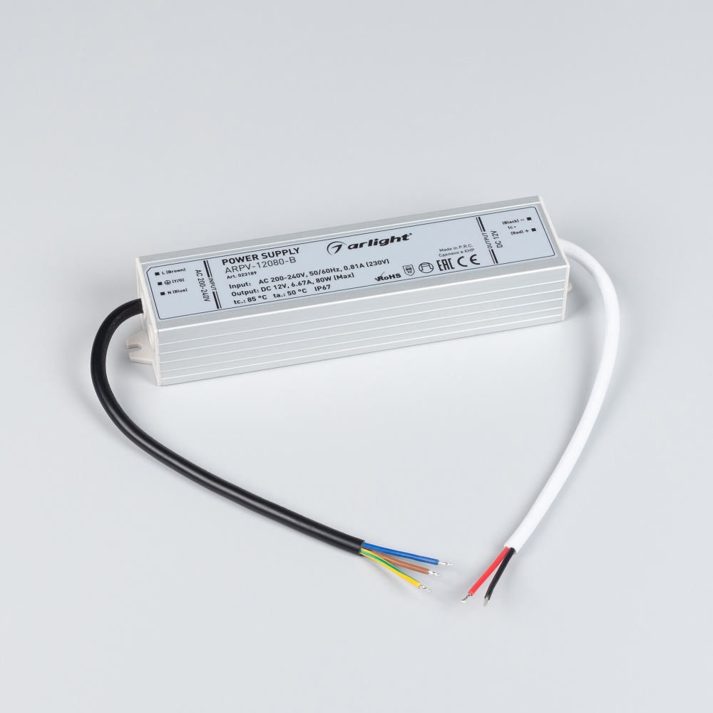Источник напряжения с гальванической развязкой для светодиодных изделий. Входное напряжение 200-240 VAC. Выходные параметры: 12 В, 6,7 А, 80 Вт. Встроенный PFC >0,5. Герметичный алюминиевый корпус IP 67. Рабочая температура -25…+50C⁰. Габаритные размеры длина 179 мм, ширина 41 мм, высота 31 мм. Совместим с диммерами с частотой ШИМ более 5кГц. Гарантийный срок 3 года.