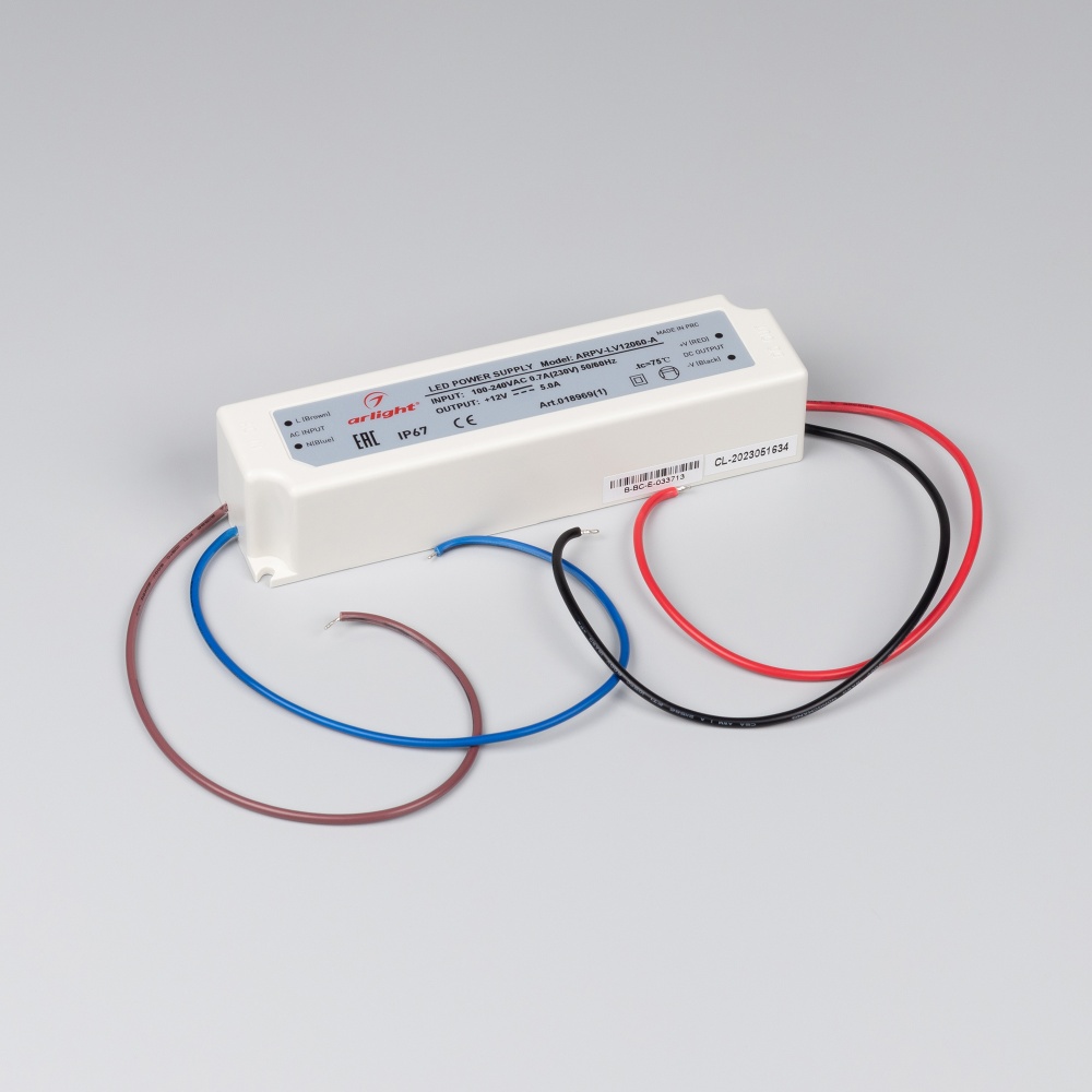 Источник напряжения с гальванической развязкой для светодиодных изделий. Входное напряжение 100 - 240 VAC. Выходные параметры: 12 В, 5 А, 60 Вт. Встроенный PFC >0,5. Герметичный пластиковый корпус IP 67. Рабочая температура -30…+70C⁰. Габаритные размеры длина 162 мм, ширина 43 мм, высота 32 мм. Гарантийный срок 3 года.