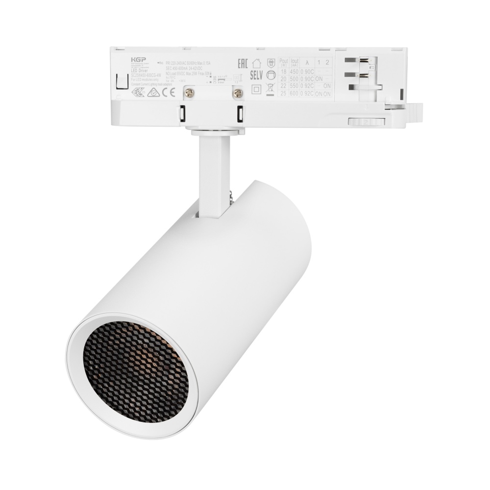Светильник подвесной для треков/шин 4 провода. Мощность 20 Вт, св. поток без решетки honeycomb 2000 лм, 100 лм/Вт, с решеткой honeycomb 1320 лм, 66 лм/Вт, дневной 4000 K, CRI>90, угол 15°, напряжение питания 230 В. Белый круглый корпус из алюминия, материал линзы PMMA, степень защиты IP20. Размер: диаметр 74 мм, длина световой части 154 мм. Монтаж на трек 3-фазный. Драйвер встроенный 24-42 В, 500мА., пульсация <5%
