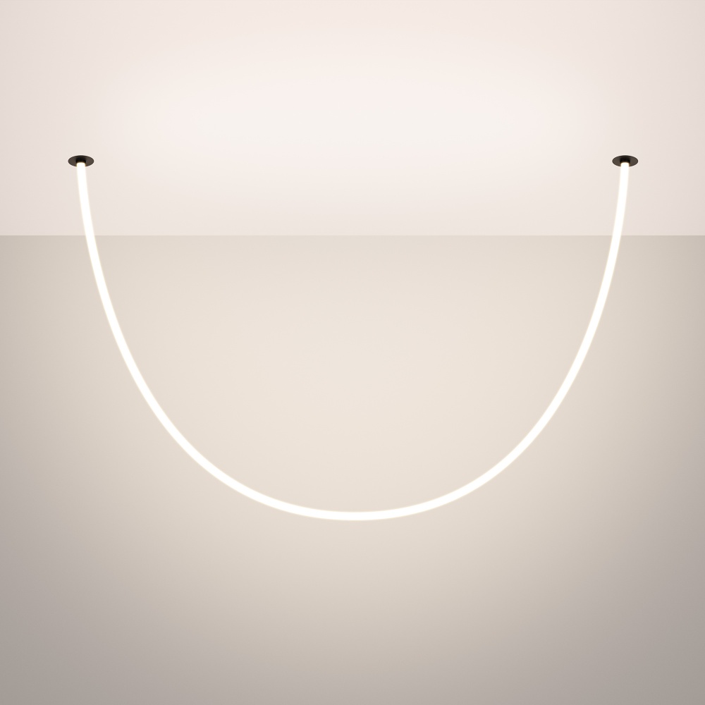 Подвесной светильник. Мощность 36 Вт, св. поток 2080 лм, 57 лм/Вт, тёплый 3000 K, CRI>90, угол 360°, напряжение питания 230 В. Черный круглый корпус из стали, силиконовая герметичная лента, степень защиты IP20. Размер: диаметр утапливаемой части чаши 64 мм, высота чаши с утапливаемой частью без вывода под неон 40 мм, общая высота чаши 57 мм, диаметр чаши с фланцем 100 мм, диаметр силиконовой герметичной ленты 18 мм, длина силиконовой герметичной ленты 2500 мм. Монтаж встраиваемый, глубина установки 55 мм, диаметр установочного отверстия 70 мм. Блок питания 24 В, 1880 мА, пульсация <1%.