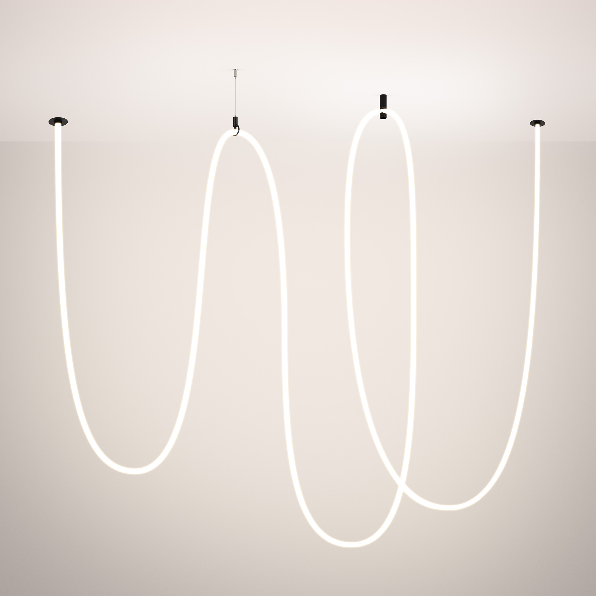 Подвесной светильник. Мощность 110 Вт, св. поток 5960 лм, 54 лм/Вт, тёплый 3000 K, CRI>90, угол 360°, напряжение питания 230 В. Черный круглый корпус из стали, силиконовая герметичная лента, степень защиты IP20. Размер: диаметр утапливаемой части чаши 64 мм, высота чаши с утапливаемой частью без вывода под неон 40 мм, общая высота чаши 57 мм, диаметр чаши с фланцем 100 мм, диаметр силиконовой герметичной ленты 18 мм, длина силиконовой герметичной ленты 10000 мм. Монтаж встраиваемый, глубина установки 55 мм, диаметр установочного отверстия 70 мм. Блок питания 24 В, 2500 мА, пульсация <5% (2 шт.).