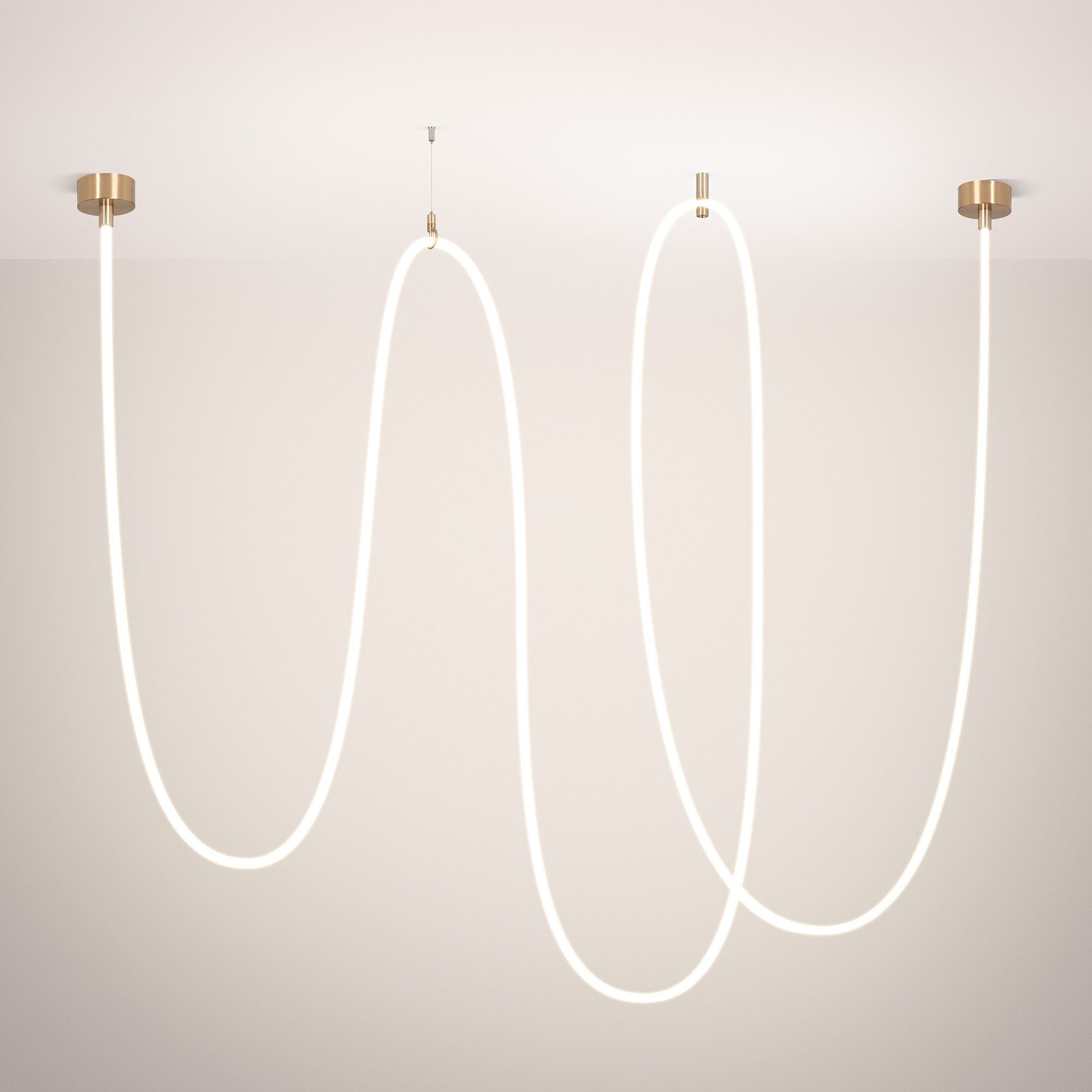 Подвесной светильник. Мощность 110 Вт, св. поток 5960 лм, 54 лм/Вт, тёплый 3000 K, CRI>90, угол 360°, напряжение питания 230 В. Золотой круглый корпус из стали, силиконовая герметичная лента, степень защиты IP20. Размер: общая высота чаши 85 мм, высота чаши без вывода под неон 50 мм, диаметр вывода под неон 35 мм, диаметр чаши 130 мм, диаметр силиконовой герметичной ленты 18 мм, длина силиконовой герметичной ленты 10000 мм. Монтаж накладной. Блок питания 24 В, 2500 мА, пульсация <5% (2 шт.). Аксессуары (подвес и крепление) приобретаются отдельно.