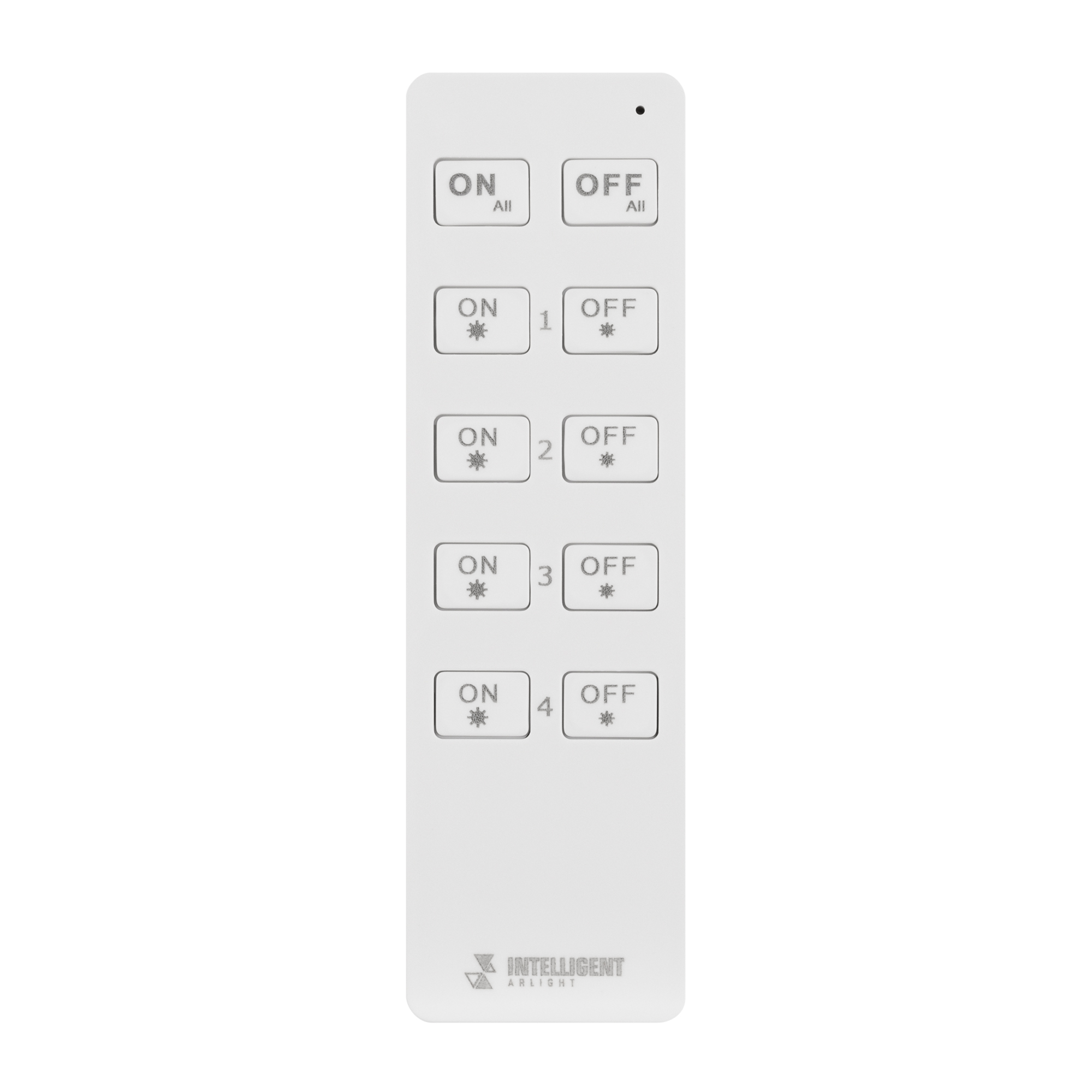 Кнопочный радиопульт 2.4 ГГц белого цвета для управления одноцветным (DIM) источником света. 4 зоны управления, управление яркостью с помощью кнопок. Питание 3VDC (CR2032). Габариты 135x40x11 мм. Изготовлен из пластика с покрытием Soft Touch. Управляет контроллерами и панелями серии SMART (поставляются отдельно). Настенные держатели приобретаются отдельно (см. аксессуары).