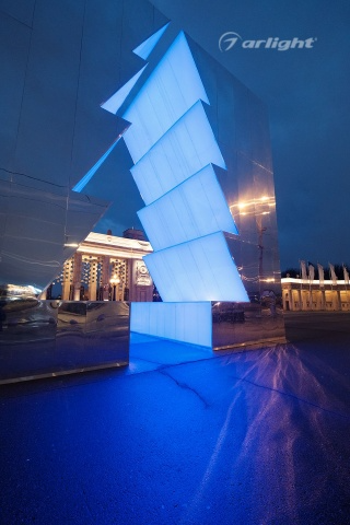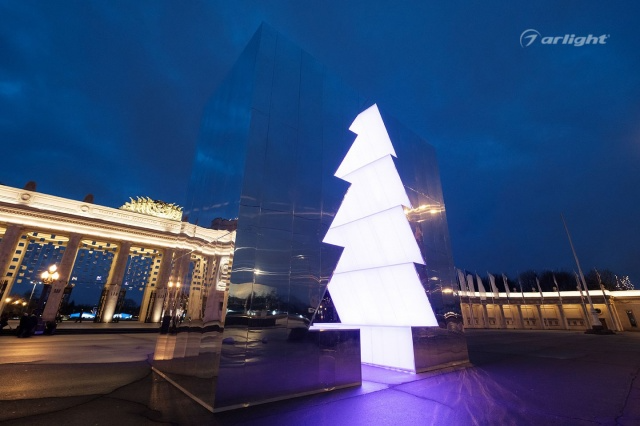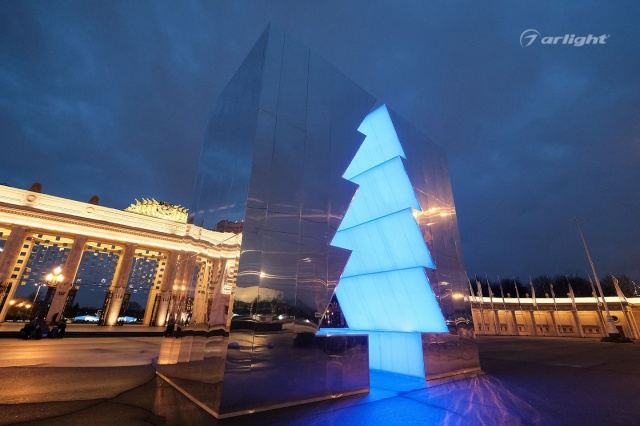 Новогодняя световая инсталляция изготовлена из зеркального композитного материала и светорассеивающего пластика. Источником света служит герметичная светодиодная лента SPI Arlight, наклеенная внутри короба витражным способом, что дает равномерную засветку пластика конструкции.